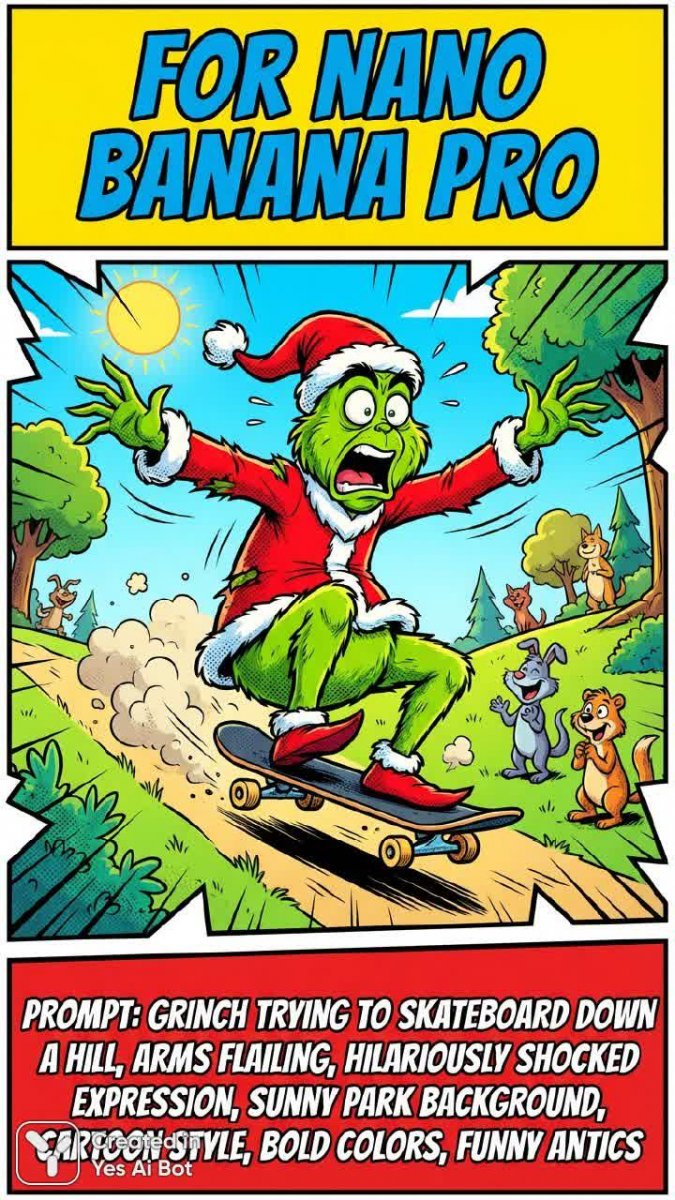 Яркий комикс-баннер, привлекающий внимание смешным и запоминающимся образом. Верхняя часть баннера акцентирует внимание на продукте 'Nano Banana Pro', используя броский шрифт и динамичный дизайн, чтобы сразу заинтересовать потенциального покупателя. Нижняя часть баннера представляет собой забавную иллюстрацию в комиксном стиле: Гринч пытается кататься на скейтборде по склону холма, его руки беспомощно взмахивают в воздухе, а на лице застыло выражение удивления и ужаса. Яркое солнечное освещение парка создает позитивную атмосферу, подчеркивая комедийность ситуации. Использование смелых цветов и динамичных элементов придает изображению энергию и привлекает взгляд. Общая композиция баннера идеально сочетает в себе рекламу продукта с юмористическим контентом, создавая запоминающийся образ, который вызывает улыбку и желание узнать больше о 'Nano Banana Pro'. Визуальный стиль выполнен в классической манере комиксов, что делает его понятным и привлекательным для широкой аудитории. Изображение идеально подходит для социальных сетей, онлайн-рекламы и других маркетинговых материалов, где требуется яркий и запоминающийся образ. Этот баннер не просто рекламирует продукт; он рассказывает небольшую историю, которая вызывает эмоции и оставляет положительное впечатление