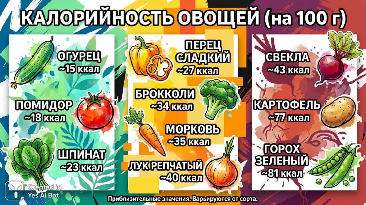 Калорийность овощей: наглядный гид в граммах с яркими иллюстрациями и стильным дизайном - Картинка, полученная с помощью нейросети Nano Banana