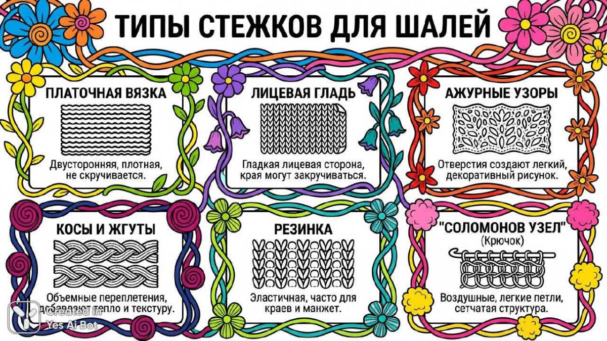 design an informative infographic in Russian explaining the types of stitches used in shawl knitting, accented by whimsical illustrations of floral motifs and threads intertwining, bold modern text, strong black outline, white fill, high contrast, bright colors.