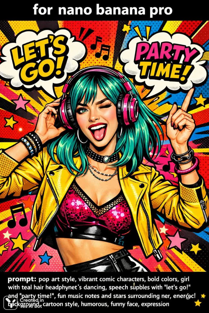 Bottom overlay: "Prompt: pop art style, vibrant comic characters, bold colors, girl with teal hair wearing headphones and dancing, speech bubbles with "LET’S GO!" and "PARTY TIME!", fun music notes and stars surrounding her, energetic background, cartoon style, humorous, funny face, exaggerated expression"