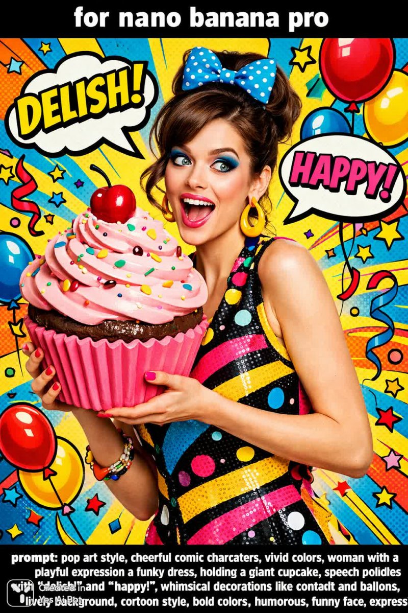 Яркий и жизнерадостный поп-арт стиль воплощен в этом визуальном произведении. В центре внимания – очаровательная женщина с игривым выражением лица, одетая в экстравагантное платье. Она держит огромный капкейк, а вокруг нее разлетаются конфетти и воздушные шары, создавая атмосферу праздника и веселья. Речь пузыри с восклицаниями 'DELISH!' и 'HAPPY!' добавляют юмора и подчеркивают позитивное настроение картины. Изображение выполнено в мультяшном стиле с использованием смелых и насыщенных цветов, что придает ему динамичность и привлекательность. Забавное лицо и преувеличенное выражение лица женщины усиливают комический эффект. Это визуальная феерия, наполненная радостью, беззаботностью и яркими красками, идеально подходящая для создания позитивного настроения и привлечения внимания к продукту Nano Banana Pro. Вся композиция излучает оптимизм и энергию, делая ее запоминающейся и привлекательной для широкой аудитории. Картина вызывает улыбку и ассоциируется с чем-то вкусным, веселым и незабываемым. Это идеальный способ передать ощущение счастья и радости от использования продукта, подчеркивая его позитивные качества и вызывая положительные эмоции у потребителя. Визуальный стиль выполнен в лучших традициях поп-арта, что делает произведение современным и актуальным