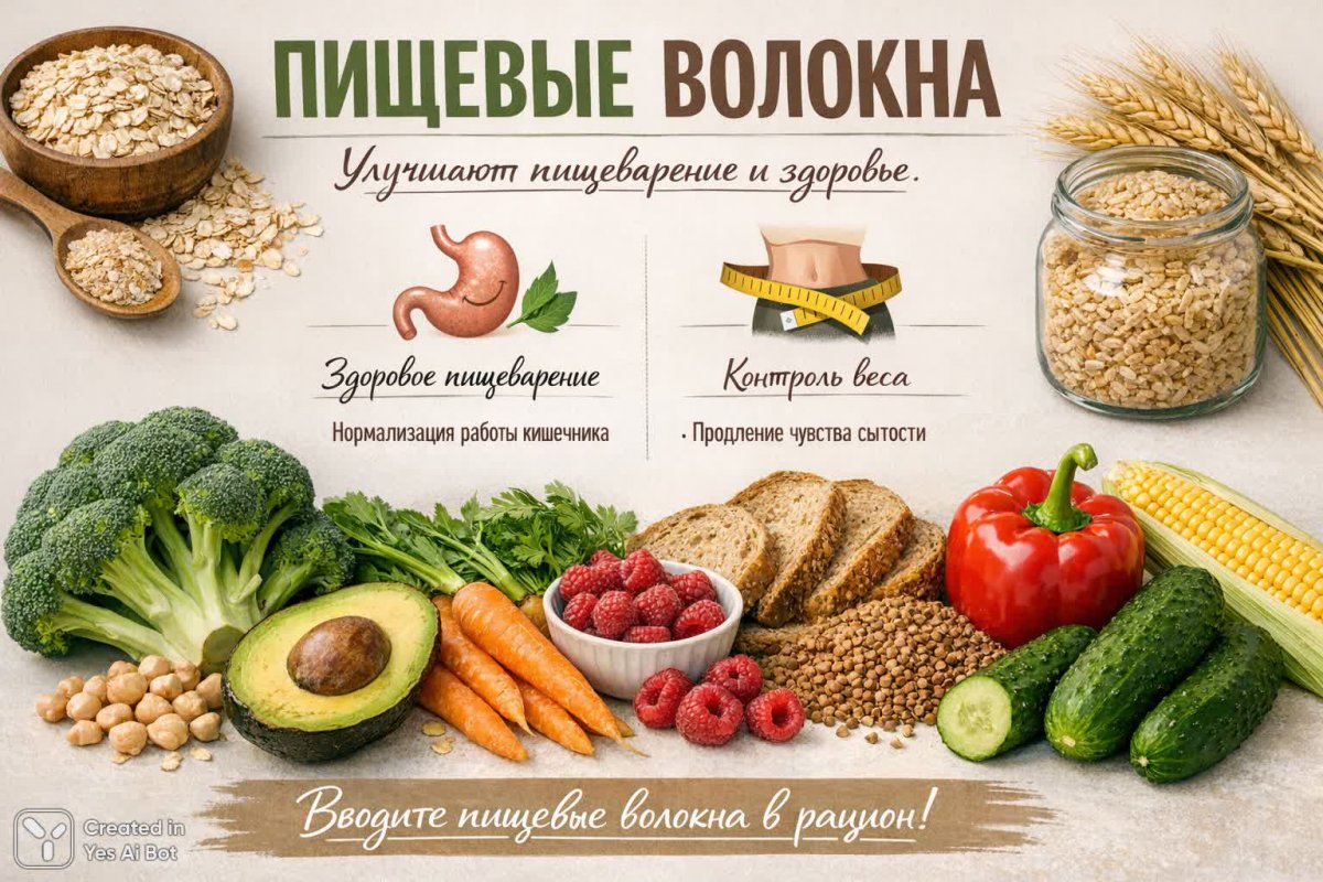 Promt: Создайте инфографику о пищевых волокнах: изображение овощей и злаков на простом фоне. Текст: "