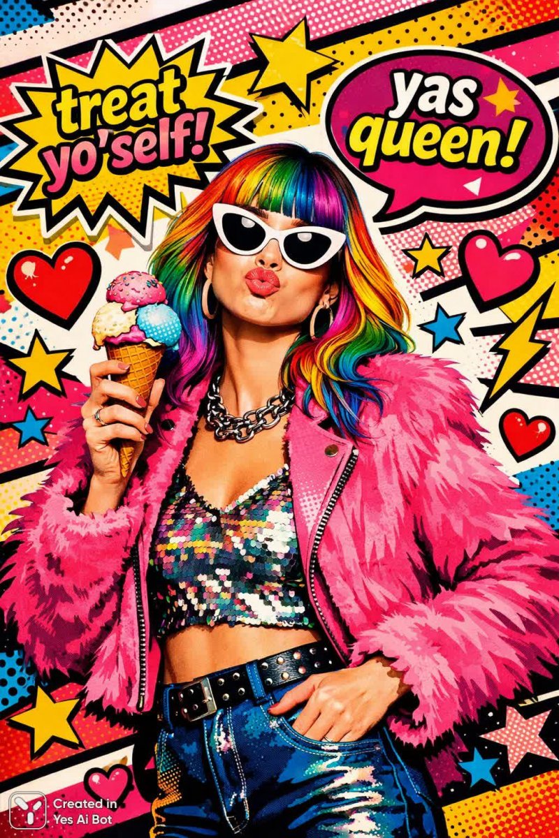 pop art style, artistic graphic collage, stylish girl with rainbow hair in a trendy outfit, holding an ice cream cone, surrounded by colorful stars and hearts, speech bubbles saying "TREAT YO' SELF!" and "YAS QUEEN!", vibrant tones, humorous, bold colors, funny face.