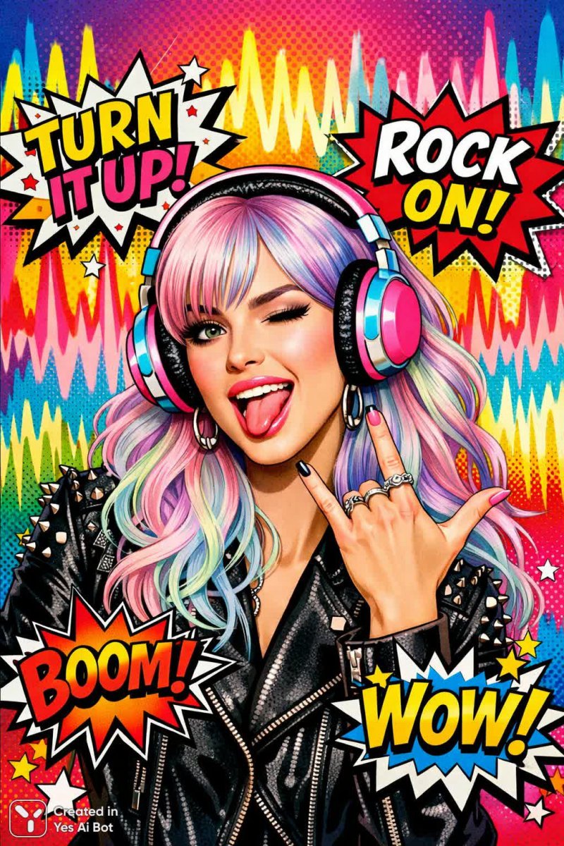 pop art style, lively comic pop art, girl with pastel-colored hair, wearing oversized headphones, surrounded by comic style boom bursts, captions "TURN IT UP!" and "ROCK ON!", vibrant sound waves background, cartoonish vibe, funny face, bold colors.