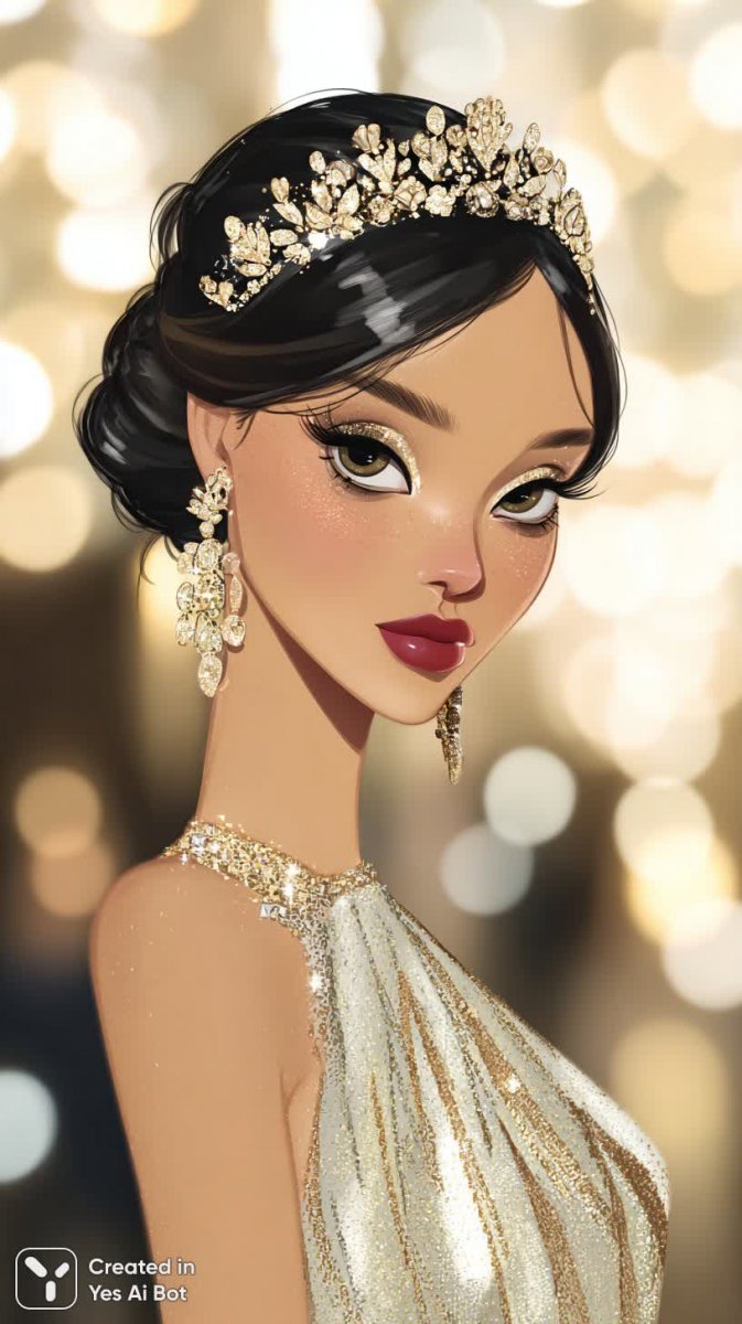 chic cartoon woman at a glamorous ballroom, portrait view, sleek black hair in a low bun, diamond tiara, smoky eyes with glitter, luscious red lips, pearl drop earrings, elegant satin gown with a flowing train; holding a vintage clutch with rhinestones, perfectly manicured nails; background: ornate chandeliers, golden decor, warm glow, soft bokeh; 2D digital illustration, clean vector lines, bold outlines, smooth cel-shading, glossy highlights, rich golds and silvers, Y2K fashion vibe, highly detailed.