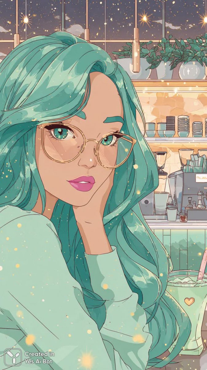 В этой яркой и стильной цифровой иллюстрации изображена молодая девушка в стиле аниме, запечатленная в непринужденной обстановке модного кафе поздней ночью. Камера делает крупный план, акцентируя внимание на ее очаровательной внешности. Короткие волнистые волосы цвета морской волны обрамляют лицо, подчеркнутое экстравагантными очками в веселой форме и блестящей золотой подводкой для глаз. Милое сердечко-наклейка игриво прикреплено к щеке, а яркая фуксия добавляет завершающий штрих ее макияжу. Девушка одета в просторный вязаный свитер, который создает ощущение уюта и тепла, а изящные ногти пастельных тонов демонстрируют заботу о деталях. В руках она держит красочный смузи, добавляющий динамики композиции. За ней простирается уютный интерьер кафе, украшенный мерцающими огоньками и светящимися кофемашинами. Использование эффекта малой глубины резкости и боке создает ощущение мечтательности и фокусирует внимание на основной теме. Рисунок выполнен в 2D технике с использованием чистых векторных линий, плавного целл-шейдинга и глянцевых бликов для создания визуально привлекательного образа. Цветовая палитра включает яркие зеленые и золотые оттенки, отражающие эстетику Y2K и добавляющие энергии всей сцене. Высокий уровень детализации позволяет рассмотреть каждую мелочь, делая изображение по-настоящему захватывающим