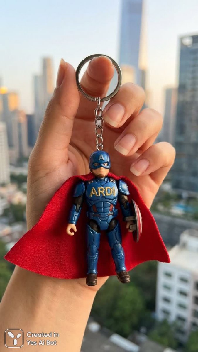 A photorealistic image of a female hand holding a keychain shaped like a superhero doll: she sports a red cape, blue outfit with “ARDI”, and a mask. In her hand, she clutches a mini shield, with a bustling city skyline behind. Photorealism, high detail, sharp focus on the doll.