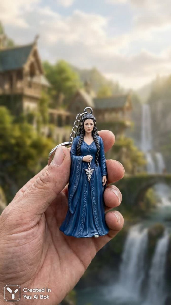 5. A photorealistic image of a hand holding a keychain of Arwen: long dark hair, wearing a flowing dress, holding a Evenstar pendant, background of Rivendell with cascading waterfalls. High detail, enchanting scenery, photorealism.