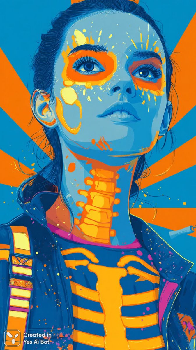 Яркий и дерзкий образ девушки в стиле аниме привлекает внимание своим необычным макияжем сочетанием электрического синего и неонового оранжевого цветов с красочными брызгами на лице. Ее взгляд направлен прямо на зрителя, создавая ощущение живого контакта. Девушка одета в эффектный костюм с мотивом черепа, который выделяется на фоне насыщенного многоцветного фона, подчеркивающего ее смелые черты. Изображение выполнено в технике цифрового 2D-арта с использованием чистых векторных линий и жирных контуров. Высокое разрешение и гладкая раскраска в стиле сель-шейдинг дополняются глянцевыми бликами, придающими изображению дополнительную выразительность. Вся композиция пропитана эстетикой y2k моды с ее характерной плоскостностью и акцентом на яркие цвета и необычные детали. Этот цифровой рисунок в стиле векторной графики представляет собой динамичный и запоминающийся образ, который обязательно привлечет внимание любителей аниме и современной поп-культуры. Он идеально подойдет для использования в качестве иллюстрации или элемента дизайна, добавляя яркости и оригинальности любому проекту. Сочетание смелых цветов и стильных деталей создает неповторимую атмосферу дерзости и креативности
