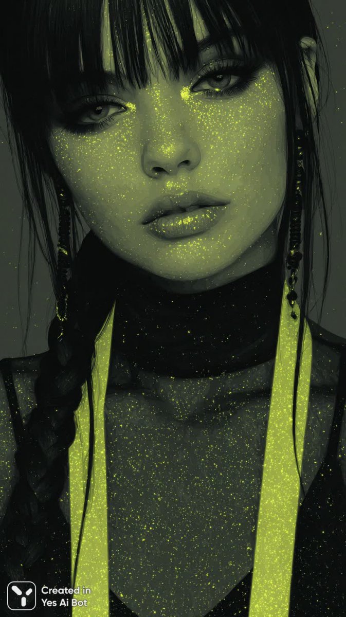 Загадочная готика в неоновом свете: девушка, чья внешность – это смелый контраст между мрачной элегантностью и яркими вспышками цвета. Ее темный макияж, словно вырезанный из ночи, оживает благодаря дерзким неоновым акцентам. Особенно выделяются губы, сияющие насыщенным неоном, словно два светящихся сердца в полумраке. Внешний вид дополняют замысловатые аксессуары, выполненные в той же яркой палитре, они перекликаются с тенями и бликами, создавая завораживающий эффект светотени – хиароскуро. Темный фон усиливает драматизм композиции, подчеркивая яркость неоновых элементов и делая образ еще более притягательным и загадочным. Каждая деталь продумана до мелочей, создавая неповторимую атмосферу таинственности и бунтарского духа, характерную для готической эстетики, но с современной интерпретацией в виде ярких неоновых красок. Это не просто портрет, а настоящее произведение искусства, где свет и тень сплетаются в гармоничном танце, а красота проявляется в неожиданном сочетании противоположностей
