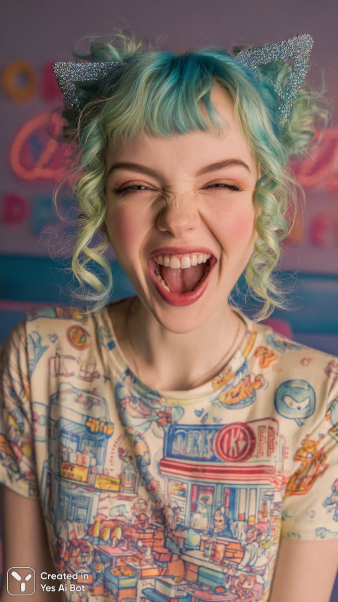 Очаровательный портрет юной девушки с небесно-голубыми волосами и милыми кошачьими ушками, заливисто смеющейся в футболке с ярким принтом. Фон картины – уютное кафе в стиле ретро, наполненное теплым свечением мерцающих неоновых вывесок, создающих атмосферу ностальгии и беззаботности. Четкие контуры и жизнерадостная палитра цветов подчеркивают позитивный настрой изображения, а захватывающая композиция притягивает взгляд зрителя, заставляя остановиться на деталях и почувствовать искреннюю радость, исходящую от модели. Картина излучает энергию молодости, оптимизма и легкости, словно приглашая окунуться в мир безграничного веселья и приятных воспоминаний. Внимание к мелочам – от прически девушки до деталей интерьера кафе – создает ощущение реалистичности и погружает зрителя в происходящее. Это не просто портрет, а целая история, рассказанная через краски и эмоции, наполненная светом и позитивом. Яркие цвета и динамичная поза модели передают чувство свободы и беззаботности, делая это произведение искусства по-настоящему запоминающимся и вдохновляющим. Идеальное сочетание деталей, композиции и цветовой гаммы создает гармоничный образ, который не оставит равнодушным никого