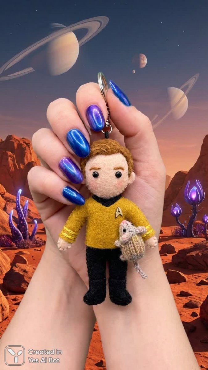 hand with a bright manicure holding a handmade keychain of a star trek character: wearing a gold uniform, holding a mouse-like creature. background: an alien planet, high detail, photorealism.