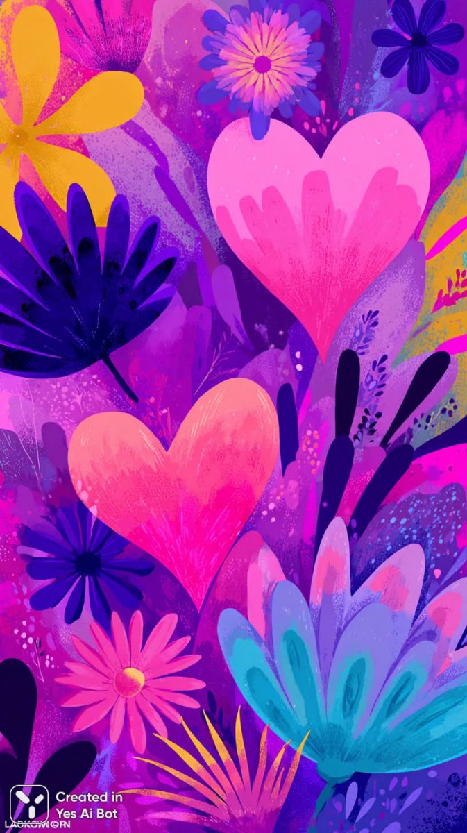bright abstract background, cartoon flowers with vibrant colors, polka dots and stripes, pop art style, cheerful atmosphere, large heart shapes, simple graphic elements, playful design.