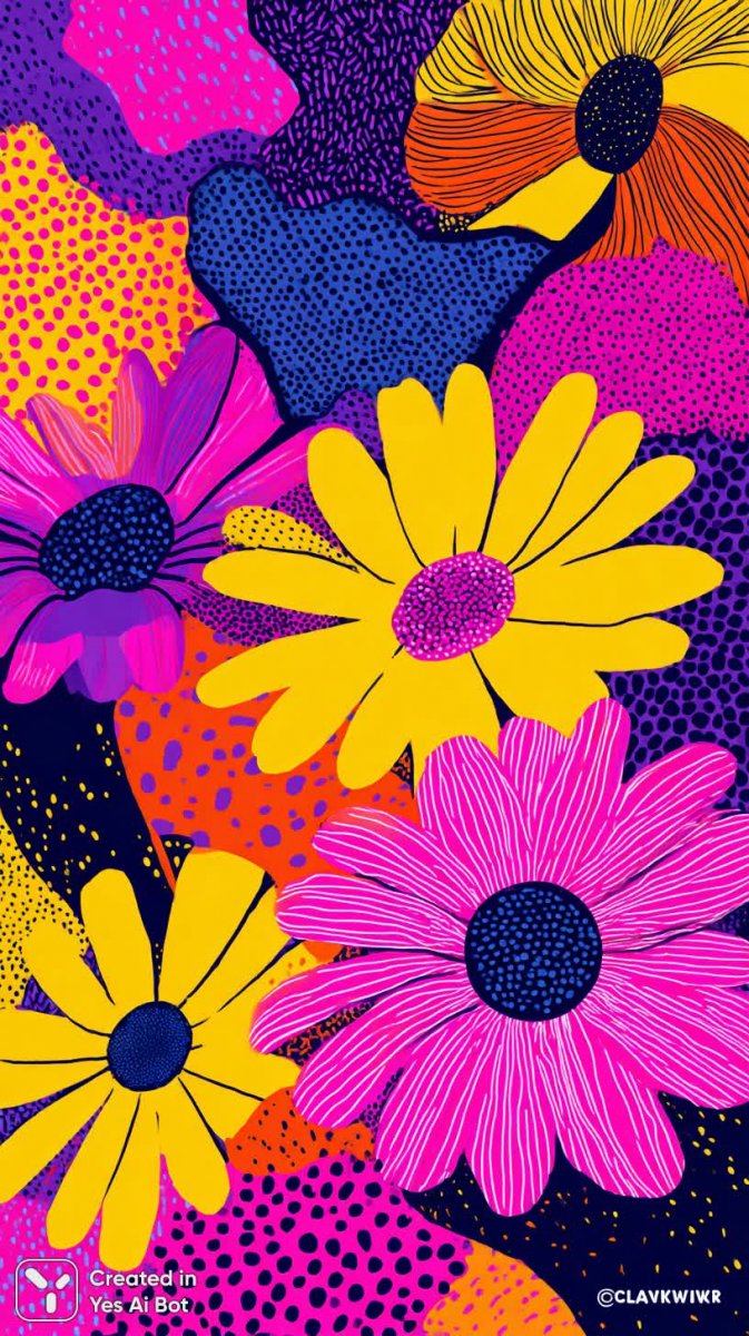 whimsical illustration, abstract shapes, pop art style, bright colors, vertical stripes, minimalism, doodle patterns, cheerful hearts and daisies, playful design.