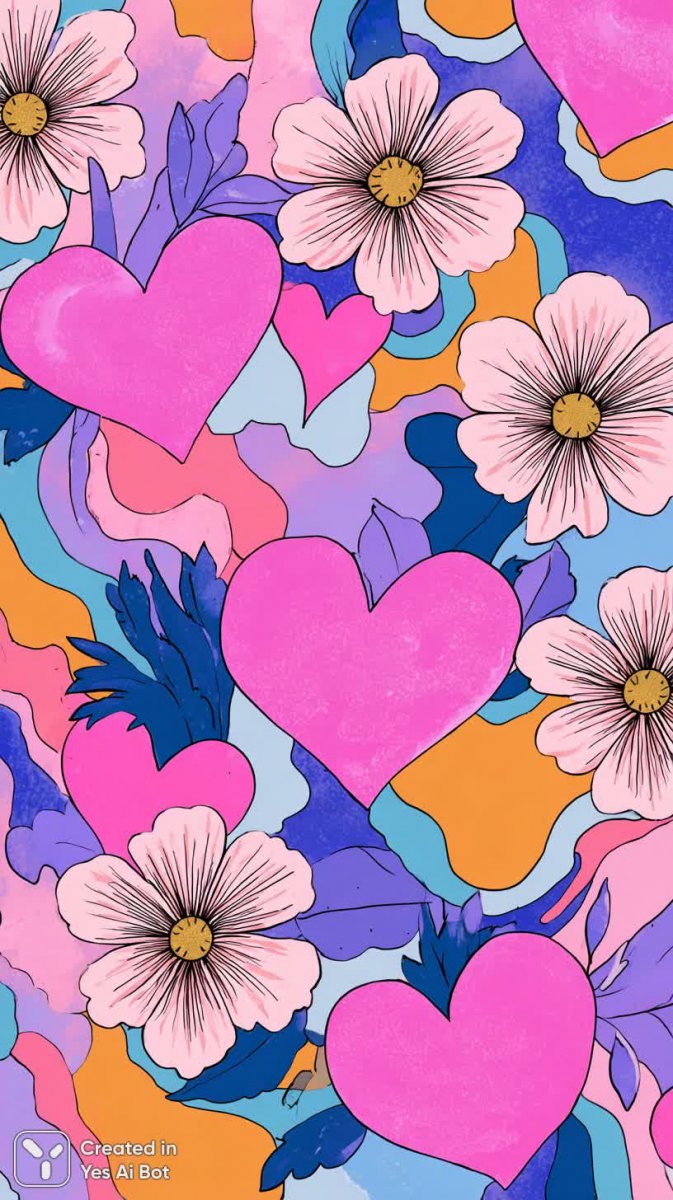 cheerful mood, abstract background, pink hearts and flowers, simple shapes, doodle style, vibrant colors, black outlines, playful composition, pop art style.