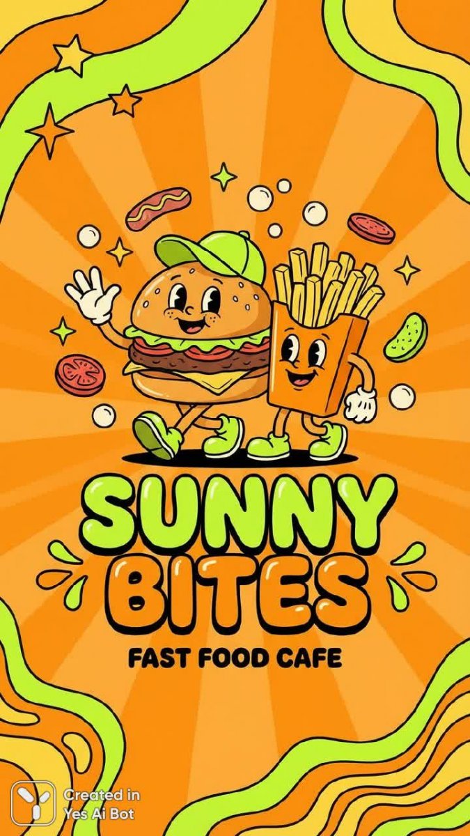 Яркий логотип кафе быстрого питания: оранжевый фон, акценты лайма, веселый маскот - Картинка из нейросети Нано Банана