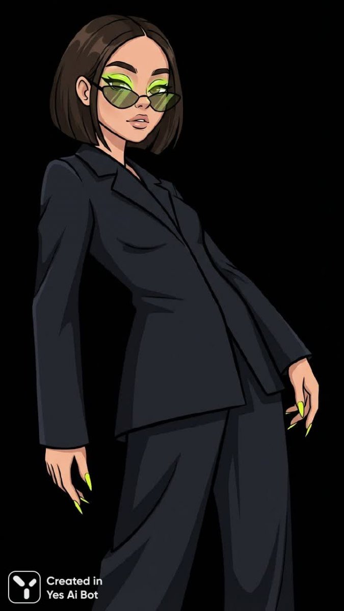 cartoon girl, vector art, flat, bold outlines, a fashion model exuding elegance with luminous neon lime makeup and stunning acid yellow nails, effortless grace, black background, smooth cel shading, anime-inspired.