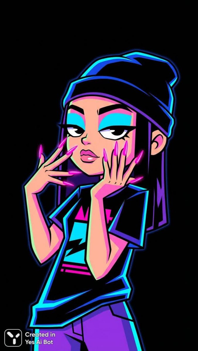 cartoon girl, vector art, flat, bold outlines, a trendy model flaunting fluorescent cerulean eyeshadow and shocking pink nails, stylish allure, black background, digital art, high-voltage brightness, animated flair.