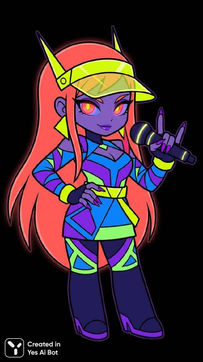 cartoon girl, vector art, flat, bold outlines, a modern diva with glaring neon coral features, phosphorescent violet manicure, acid yellow details, anime-inspired theme, black background, electric style, high-definition clarity.
