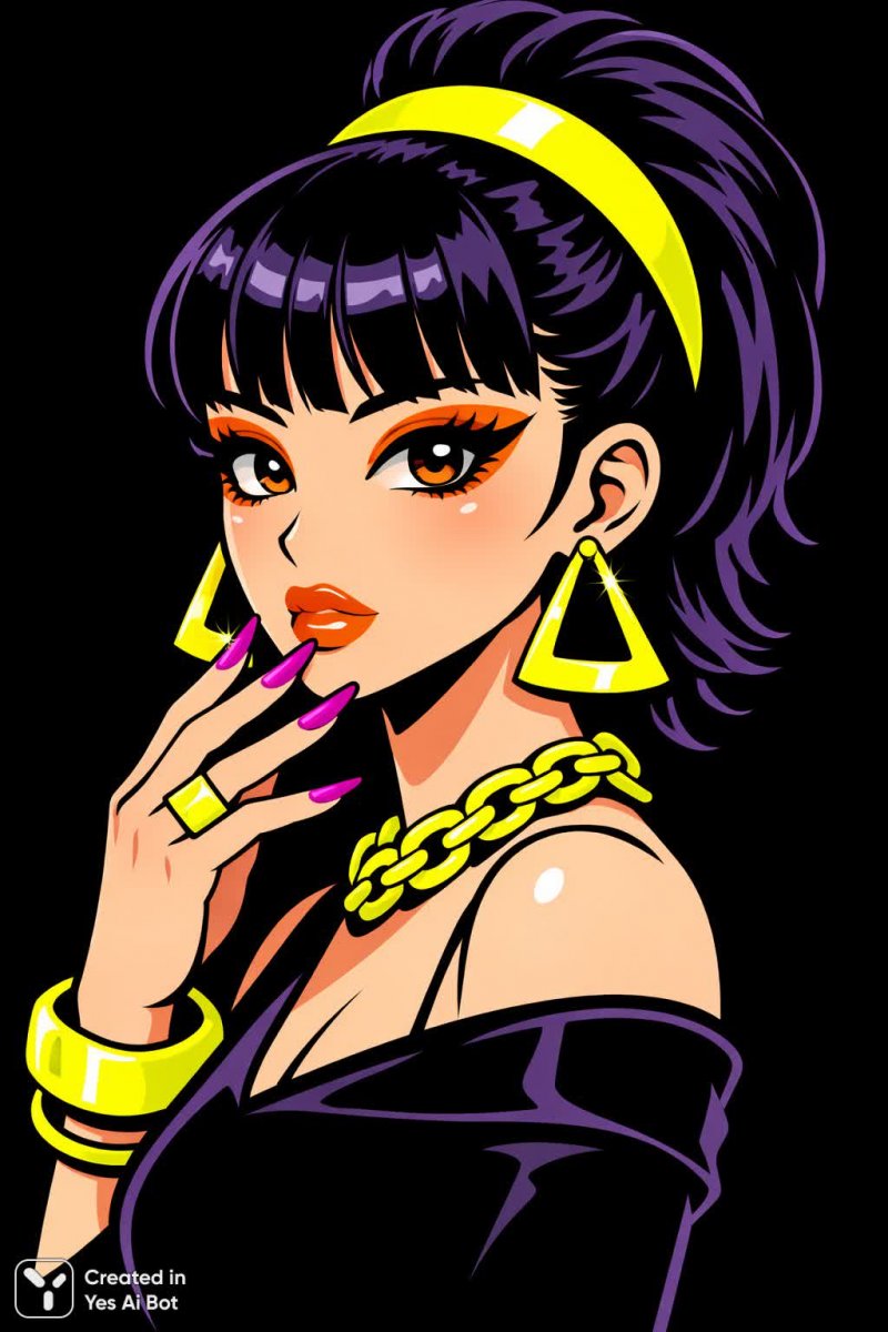 Яркая и дерзкая иллюстрация в стиле ретро с использованием векторной графики демонстрирует очаровательную героиню мультфильма. Ее образ выделяется на фоне глубокого черного цвета благодаря смелым контурам и насыщенным неоновым акцентам. Макияж в оранжевых тонах создает эффект сияния, а маникюр насыщенного маджента добавляет образу игривости и энергии. Дополняют стиль яркие аксессуары кислотно-желтого цвета, которые подчеркивают динамичность персонажа. Вдохновленный эстетикой аниме дизайн отличается четкостью линий и плоским стилем, что делает изображение современным и запоминающимся. Высокое разрешение обеспечивает отличную детализацию, позволяя рассмотреть мельчайшие элементы стиля – от текстуры волос до бликов на коже. Это произведение искусства сочетает в себе ностальгию по ретро-эпохе и современные тенденции цифрового дизайна, создавая уникальный визуальный образ, который привлекает внимание своей смелостью и оригинальностью. Изображение идеально подходит для использования в различных проектах – от иллюстраций для детей до создания стильных графических элементов для веб-дизайна или рекламы. Неоновые цвета и динамичный стиль гарантируют, что этот персонаж запомнится надолго
