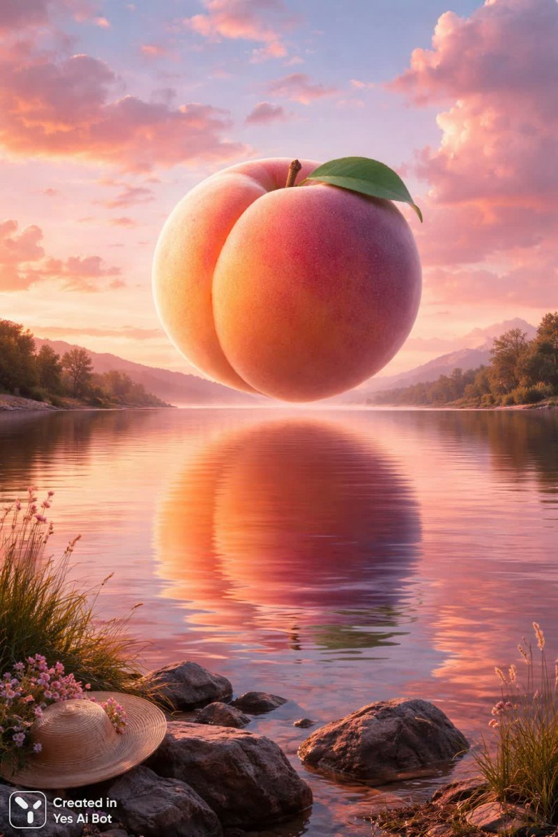 Плавающий персик над спокойным озером: сюрреалистический пейзаж - Пример изображения, созданного ИИ Sora Image