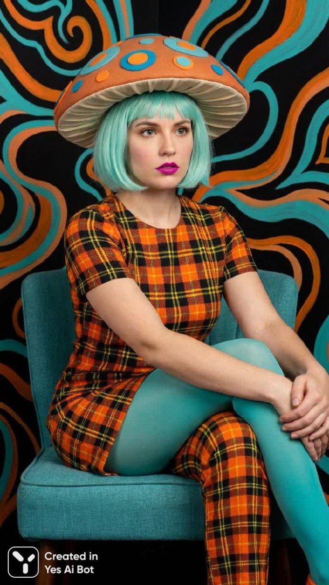 Психоделический сюрреализм, яркие цвета, цветовое блокирование: оранжевый, бирюзовый, чёрный. Женщина европеоидного типа с короткими светло-бирюзовыми волосами, ярко-маджентовыми губами, яркими и тёмными тенями для век, сосредоточенное выражение лица. Ретро-футуристический стиль: платье и брюки в клетку (оранжевый, чёрный, жёлтый), бирюзовые колготки. На голове грибовидная шляпа с круглыми украшениями по бокам. Модель сидит, ноги сдвинуты и согнуты, руки расслаблены перед ней. Средний план, мягкое рассеянное освещение, чёрный фон. Центрированная композиция, энергичное настроение, визуальный цикл от шляпы к лицу, одежде и сине-зелёному стулу.