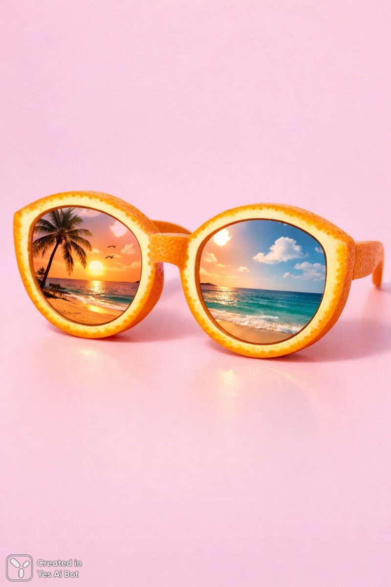 Оранжевый закат на розовом фоне: причудливое отражение пляжа в винтажных очках - Пример изображения, созданного ИИ Sora Ai Images