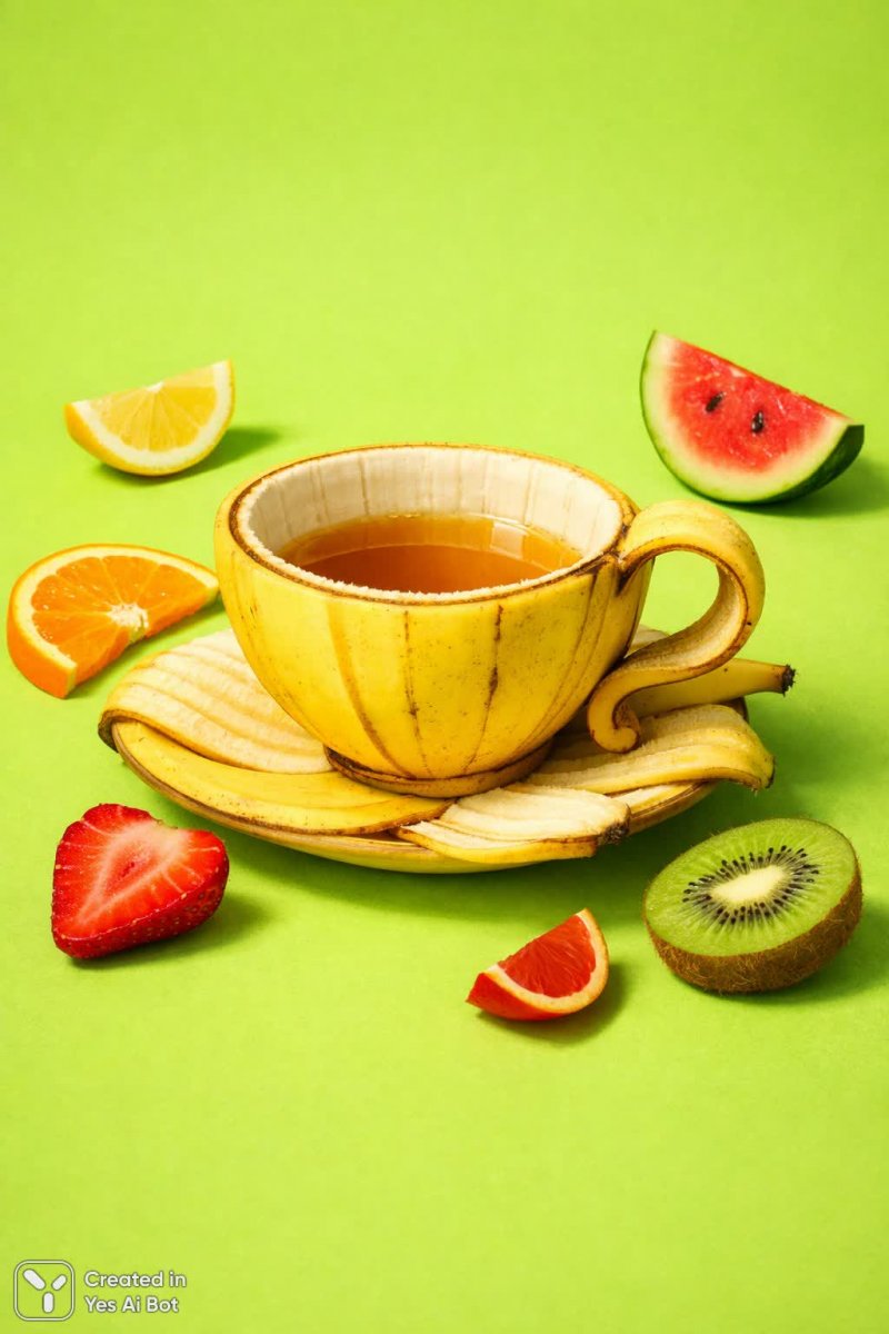 a surreal teacup made from a banana peel, resting on a vivid lime green surface, accented by colorful fruit slices, playful and creative composition, soft shadows, high clarity, minimalistic style.