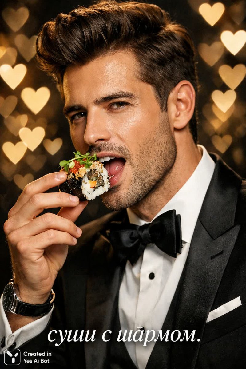 Мужчина в безупречном смокинге и галстуке-бабочке демонстрирует изысканный вкус, наслаждаясь куском восхитительного суши. Идеально ровный рулет, украшенный нежными микрозеленью, словно произведение искусства, подчеркивает утонченность момента. Игра света создает романтическую атмосферу благодаря боке в форме сердца, добавляя образу особую теплоту и чувственность. Сочетание элегантности стиля и гастрономического удовольствия делает этот кадр настоящим гимном гурману. Впечатление легкости и изысканности передается каждым движением, каждым деталью, создавая ощущение праздника и роскоши. Визуальный акцент на свежести ингредиентов и мастерстве приготовления подчеркивает ценность каждого кусочка. Этот образ – воплощение стиля, вкуса и утонченного наслаждения жизнью. Снимок излучает уверенность, элегантность и неподдельный интерес к прекрасным вещам. Это не просто еда, это ритуал, который дарит эстетическое удовольствие и заряжает позитивной энергией. Ощущение гармонии и совершенства пронизывает весь образ, создавая атмосферу утонченности и благородства