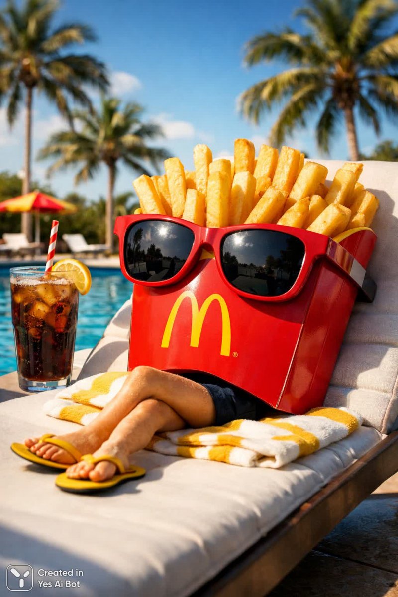 studio photo, photorealistic style, shot on canon eos r5, 50mm lens, cinematic lighting, surreal, mcdonald's fries box wearing sunglasses lounging by a pool, palm trees in the background, vibrant colors, logo art, high resolution, humorous, unexpected composition, wacky.