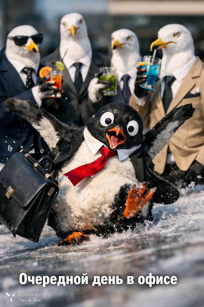 meme, photorealistic, text on russian, shot with canon eos r5, 50mm f/1.8, dynamic angle, high-quality, vivid colors, penguin wearing a tie and holding a briefcase, slipping on ice while trying to impress a group of seagulls in suits, flailing wings, wide-eyed look of panic, seagulls looking unfazed and sipping cool drinks, ironic caption below reading "just another day at the office"