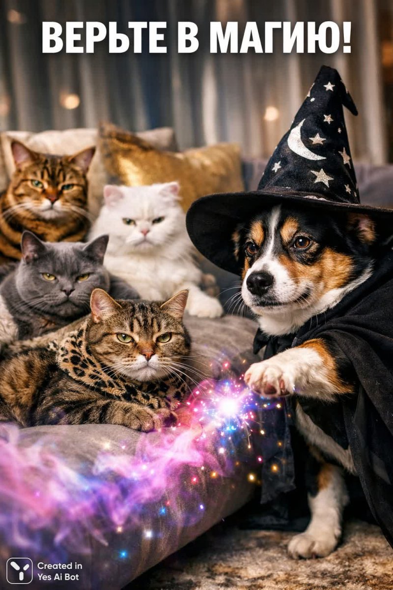 meme, photorealistic, text on russian, shot with canon eos r5, 50mm f/1.8, dynamic angle, high-quality, vivid colors, dog wearing a wizard hat casting imaginary spells over a group of skeptical cats, cats lounging on a couch with raised eyebrows, sparkles and colorful smoke effects around, the dog's face full of exaggerated determination, cheeky line above: "believe in magic!"
