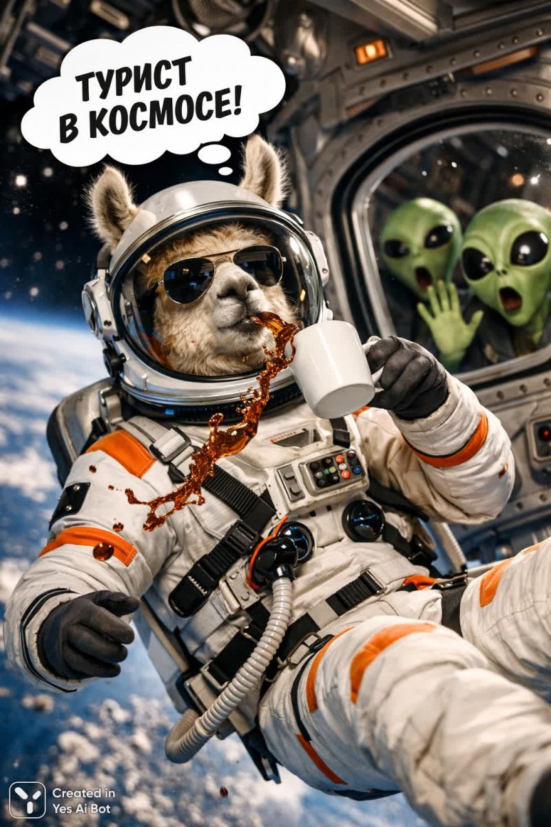 meme, photorealistic, text on russian, shot with canon eos r5, 50mm f/1.8, dynamic angle, high-quality, vivid colors, llama decked out in a spacesuit floating in zero gravity while sipping coffee, bewildered aliens watching from a spacecraft window, nonchalant expression as coffee spills in slow motion, sarcastic thought bubble reads "tourist in space!"