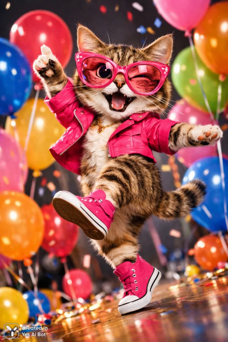 cartoon cat with large pink glasses, standing on one leg, silly dance pose, colorful balloons around, vibrant illustration style, joyful expression, BG, photorealistic quality, low angle shot, 35mm lens.
