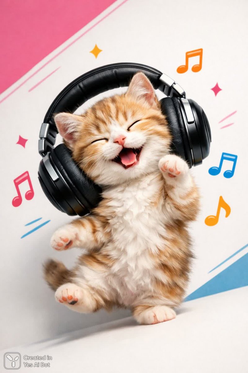 sora Танцующий котенок в огромных наушниках: яркая радость и минимализм. Изображение из нейросети Sora Ai Images