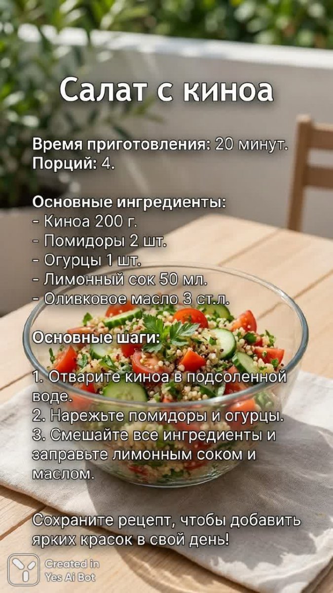 Свежий и легкий салат из киноа – идеальное решение для быстрого обеда или ужина. Этот простой рецепт займет всего 20 минут вашего времени и порадует вас своим насыщенным вкусом и пользой. В основе блюда – киноа, богатый источник белка и клетчатки, который прекрасно сочетается с сочными помидорами и хрустящими огурцами. Лимонный сок придает салату приятную кислинку, а оливковое масло – нежный аромат. Этот салат станет настоящим открытием для тех, кто следит за своим здоровьем и предпочитает легкие и полезные блюда. Он прекрасно подходит для вегетарианцев и всех, кто хочет разнообразить свой рацион. Яркие цвета овощей и аппетитный вид делают этот салат не только вкусным, но и привлекательным. Не упустите возможность добавить в свое меню это простое, но невероятно полезное блюдо! Легко приготовить, легко наслаждаться – идеальный выбор для тех, кто ценит время и заботится о своем здоровье. Сохраните этот рецепт, чтобы всегда иметь под рукой отличный вариант быстрого и вкусного перекуса или гарнира. Насладитесь вкусом лета в любое время года!