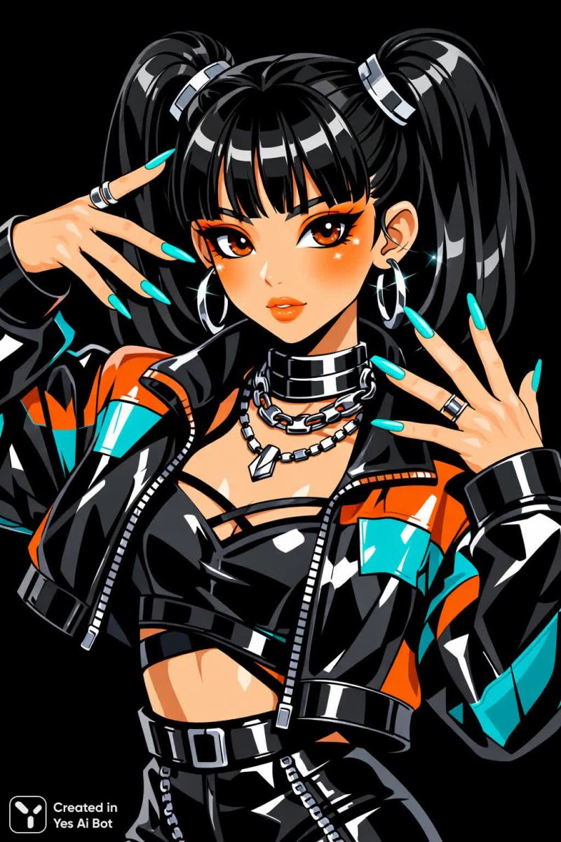 На иллюстрации в стиле аниме изображена энергичная девушка с ярким и смелым образом, созданным нейросетью Sora Images AI. Она одета в футуристическую одежду, сочетающую современные тенденции и фантазийные элементы. Особое внимание привлекает ее макияж в оранжевых тонах и маникюр с острыми неоново-бирюзовыми ногтями, создающими эффект сияния. Фон выполнен в глубоком черном цвете, подчеркивающем насыщенность цветовой палитры образа. Работа выполнена в технике векторной графики с четкими контурами и высоким разрешением HD, что обеспечивает детализацию и реалистичность изображения благодаря использованию глянцевых бликов. Композиция передает ощущение движения и энергии, а плоский дизайн придает ей современный и стильный вид. В целом, это визуально привлекательный арт-объект, подходящий для различных медиапроектов, в том числе рекламы и дизайна персонажей видеоигр. Создание работы было осуществлено с помощью искусственного интеллекта, а стиль исполнения сочетает элементы моды и роскоши, с акцентом на деталях.