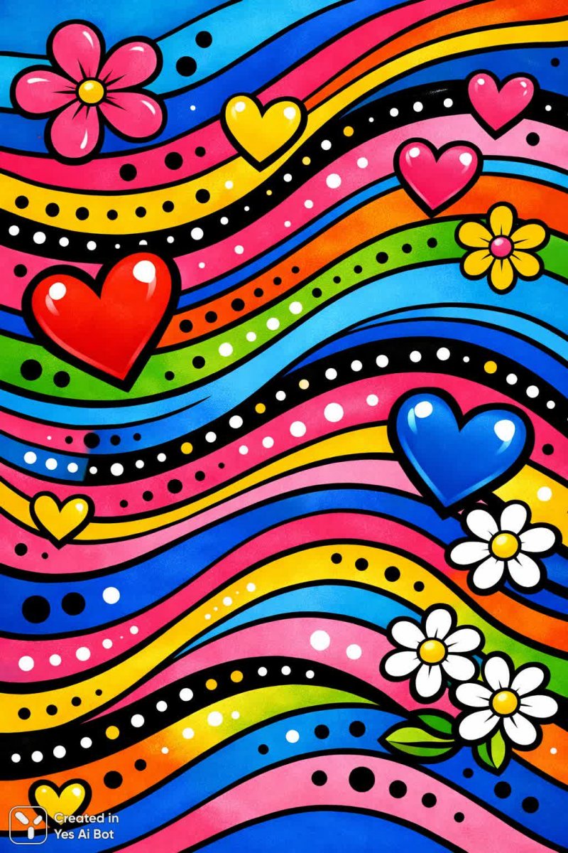 abstract waves and dots, bright saturated colors, cartoonish elements, hearts and flowers, ink illustration, pop art style, cheerful atmosphere, minimalistic graphics, expressive lines.