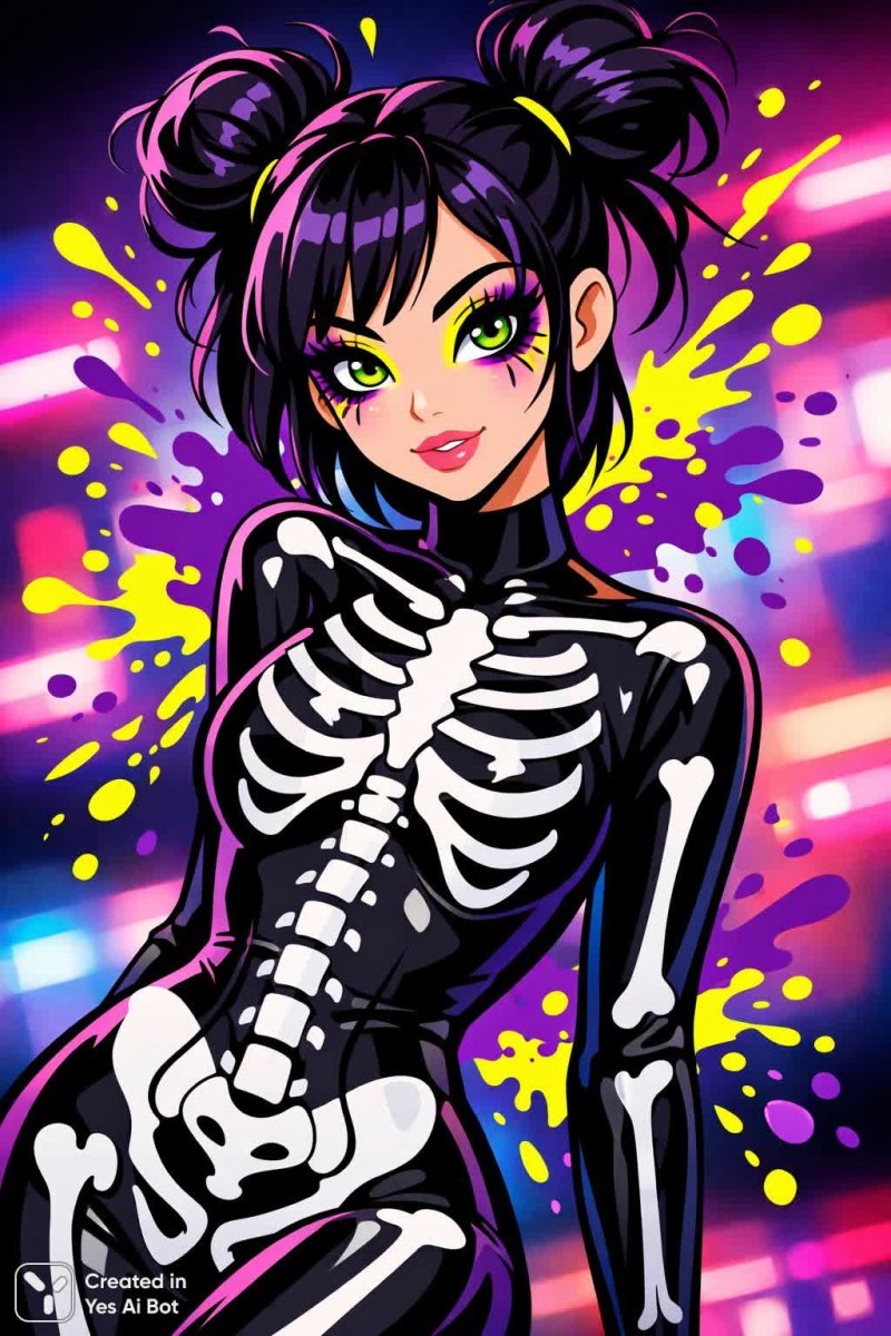 a girl with striking neon yellow and purple makeup wears a black bodysuit with skeleton motifs, creating an eye-catching style. her bright eyes sparkle with artistic splatters surrounding her, against a blurred neon background that enhances her dynamic presence. stylish cartoon girl, 2d digital art, clean vector lines, bold outlines, hd, vector art, smooth cel shading, glossy highlights, y2k fashion vibe, flat, look at the viewers.