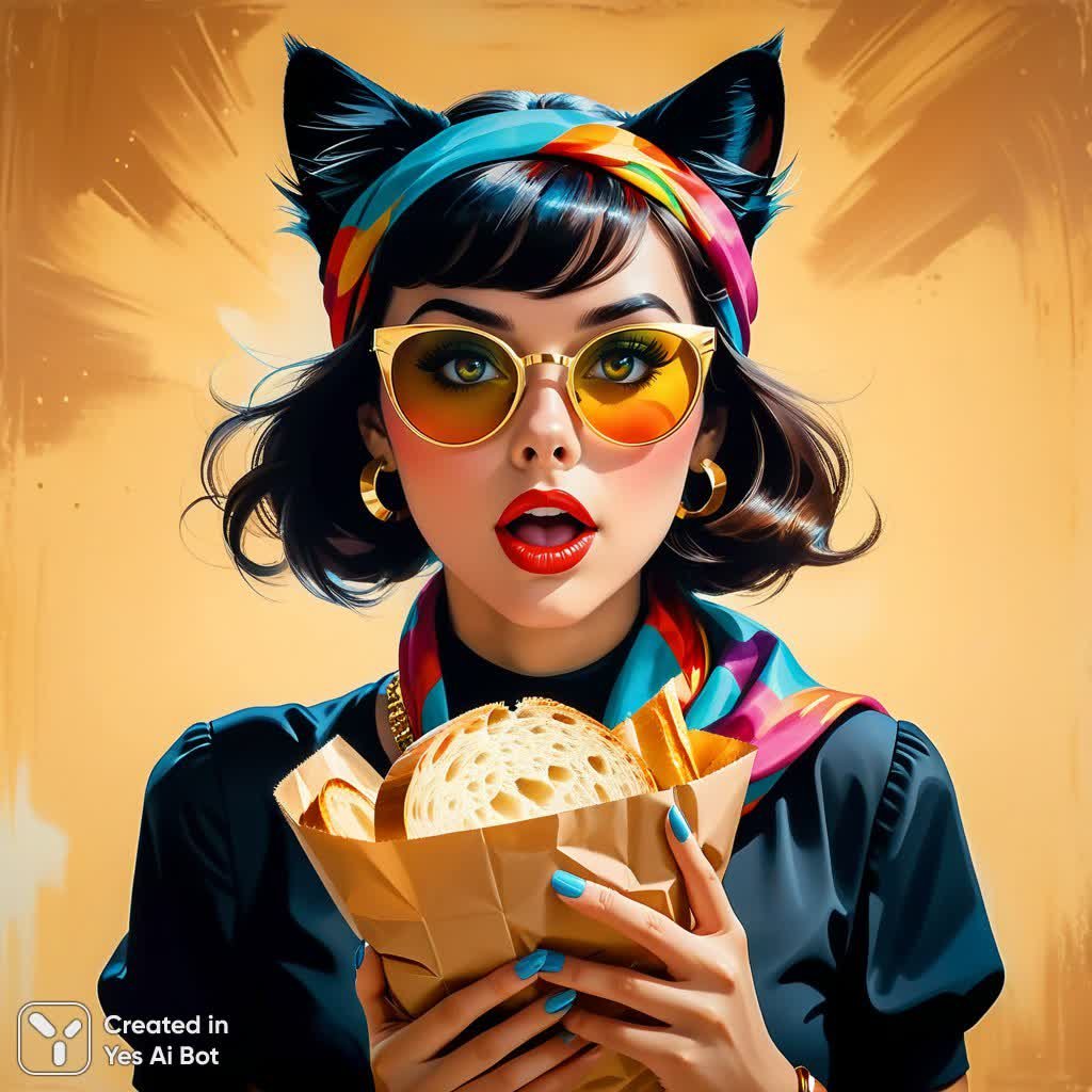 Загадочная встреча с моментом наслаждения: портрет женщины, запечатленный в акварельной палитре и смелых мазках акрила, повествует о спонтанности и изяществе. Её темные волосы контрастируют с ярким калейдоскопом красок платка, увенчивающего голову, а стильные черные солнцезащитные очки в форме 'кошачьих глаз' придают образу нотку загадочности и уверенности. Элегантный черный топ без рукавов подчеркивает её фигуру, создавая гармоничный баланс между строгостью и легкостью. В руках она держит наполовину съеденный французский хлеб в помятой бумажной упаковке, крошки на пальцах свидетельствуют о недавнем удовольствии. Её рот широко раскрыт в выражении удивления или восторга, словно она только что пережила приятное открытие, вынимая кусочек хлеба из батона. На запястье сверкает золотые часы, намекая на ценность времени и мгновения. Фон слегка размыт, акцентируя внимание на фигуре женщины и её эмоциях, создавая ощущение погружения в личный мир. Высочайшая детализация, разрешение 4K и статус 'шедевра' подчеркивают мастерство исполнения и стремление к совершенству. Острота фокуса позволяет рассмотреть каждую деталь: от текстуры ткани до мельчайших морщинок на лице, передавая всю глубину и реалистичность момента. Картина словно оживает, приглашая зрителя разделить с ней это мимолетное мгновение радости и удивления, запечатленное в вечном искусстве