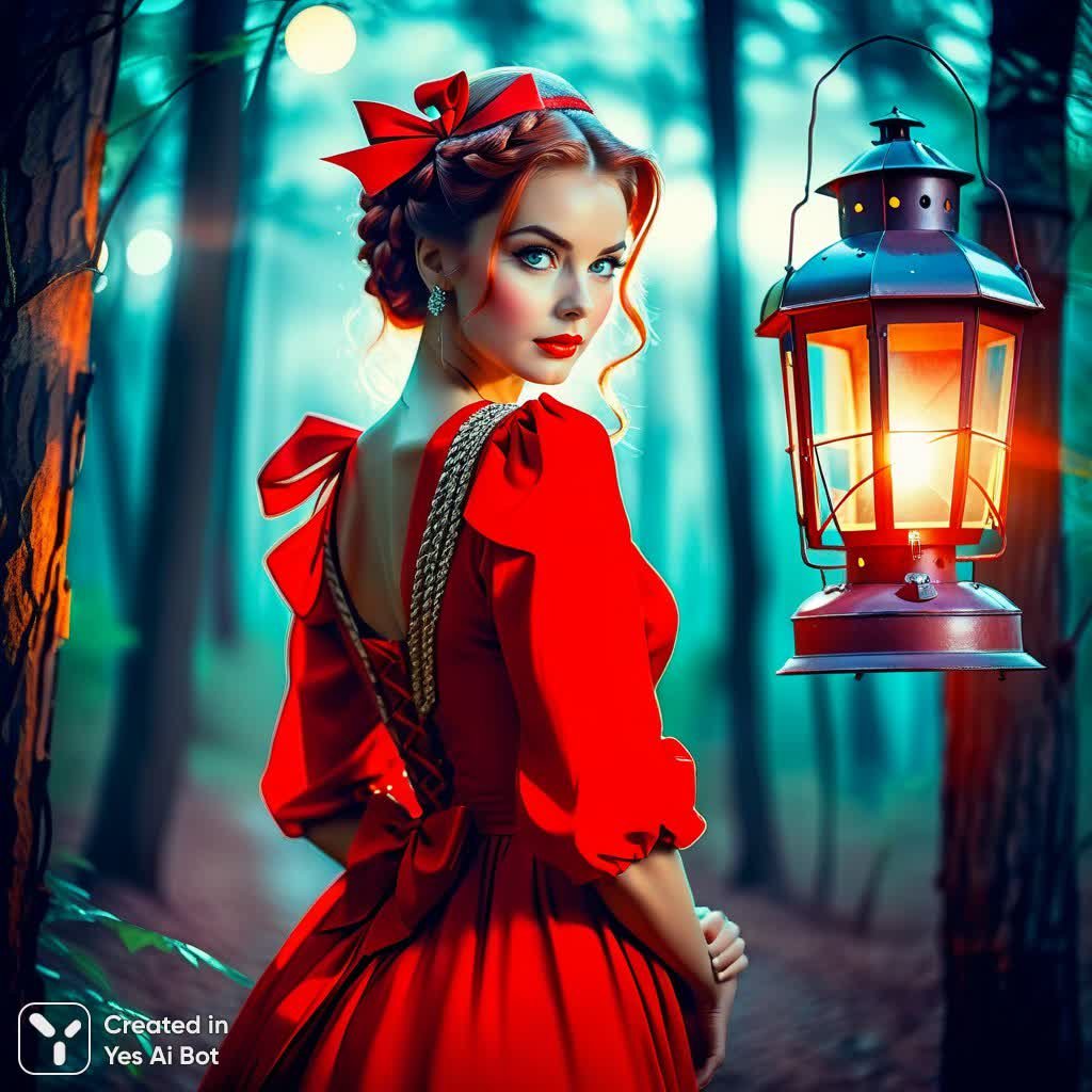 Загадочная незнакомка в винтажном алом платье, словно сошедшая с полотен эпохи прошлых столетий, застыла в случайной позе среди дремучего леса. Её каштановое косо плетено в изящную косу и украшено нежным бантом, добавляющим образу наивности и очарования. В руках она бережно держит старинный фонарь, его мягкий свет едва пробивается сквозь густую листву, создавая атмосферу таинственности и умиротворения. В её взгляде, обращенном на мерцающий огонек, читается задумчивость и легкая грусть. Кажется, она словно охраняет древнюю тайну или ждет наступления волшебной ночи. Мягкое освещение подчеркивает реалистичность изображения, передавая мельчайшие детали ткани платья, текстуру волос и отблески света в её глазах. Эта картина – настоящее произведение искусства в стиле реалистичной фэнтези, вызывающее ощущение сказочного сна. Она идеально подходит для создания атмосферы спокойствия и уюта, напоминая о красоте природы и очаровании старинных легенд. Это прекрасный способ пожелать доброй ночи и погрузиться в мир грез, полный волшебства и тайн. Идеальное сочетание нежности, загадочности и реалистичной детализации делает это изображение поистине завораживающим