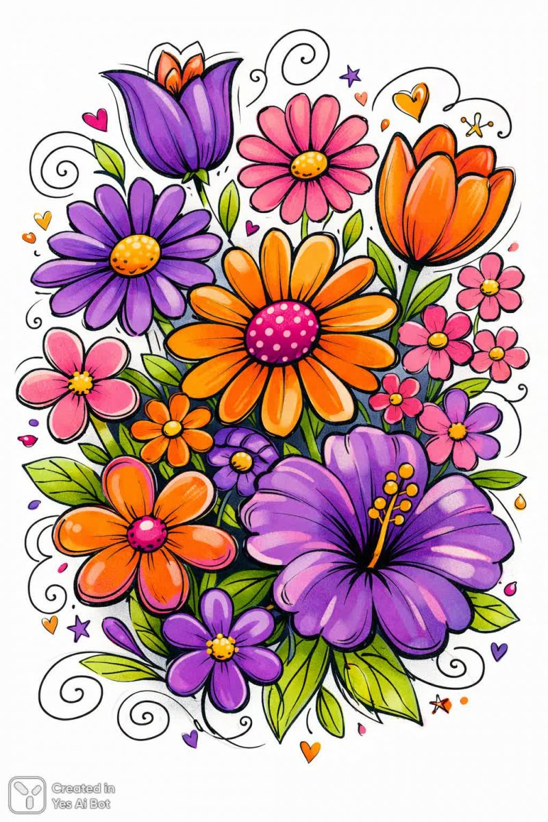 Игривый набросок, жизнерадостная цветочная композиция, наполненная разнообразием форм цветов и яркими красками. Преобладают насыщенные оттенки пурпурного, сочного оранжевого и глубокого черного, создавая динамичную и артистическую атмосферу. Кажется, будто букет расцветает прямо на холсте, излучая оптимизм и творческий порыв. Каждый цветок уникален в своей форме и деталях, что придает композиции неповторимый характер и ощущение легкости. Этот рисунок – настоящий гимн весне и радости жизни, способный поднять настроение даже в самый пасмурный день. Он словно приглашает зрителя окунуться в мир фантазии и вдохновения, где нет места скуке и однообразию. Яркие акценты черного цвета добавляют контраста и глубины, делая изображение более выразительным и запоминающимся. В целом, работа производит впечатление спонтанного, но тщательно продуманного произведения искусства, отражающего безграничную энергию и креативность автора. Это не просто цветочный узор, а настоящий праздник цвета и формы, способный украсить любое пространство и подарить ощущение гармонии и радости