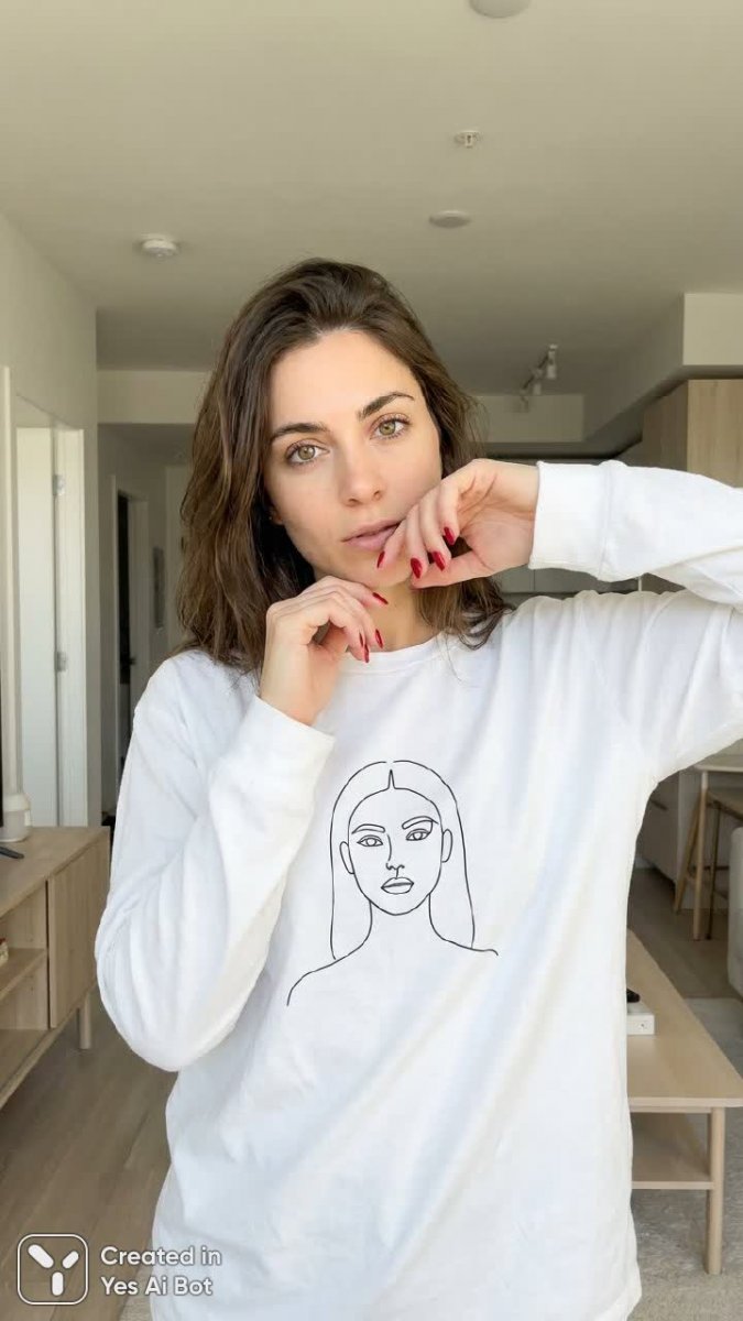 fashion model, hazel eyes, woman in a white long-sleeve shirt with minimalist female portrait, red nails, expressive eyes, casual look, emphasis on femininity, modern clothing, light interior.