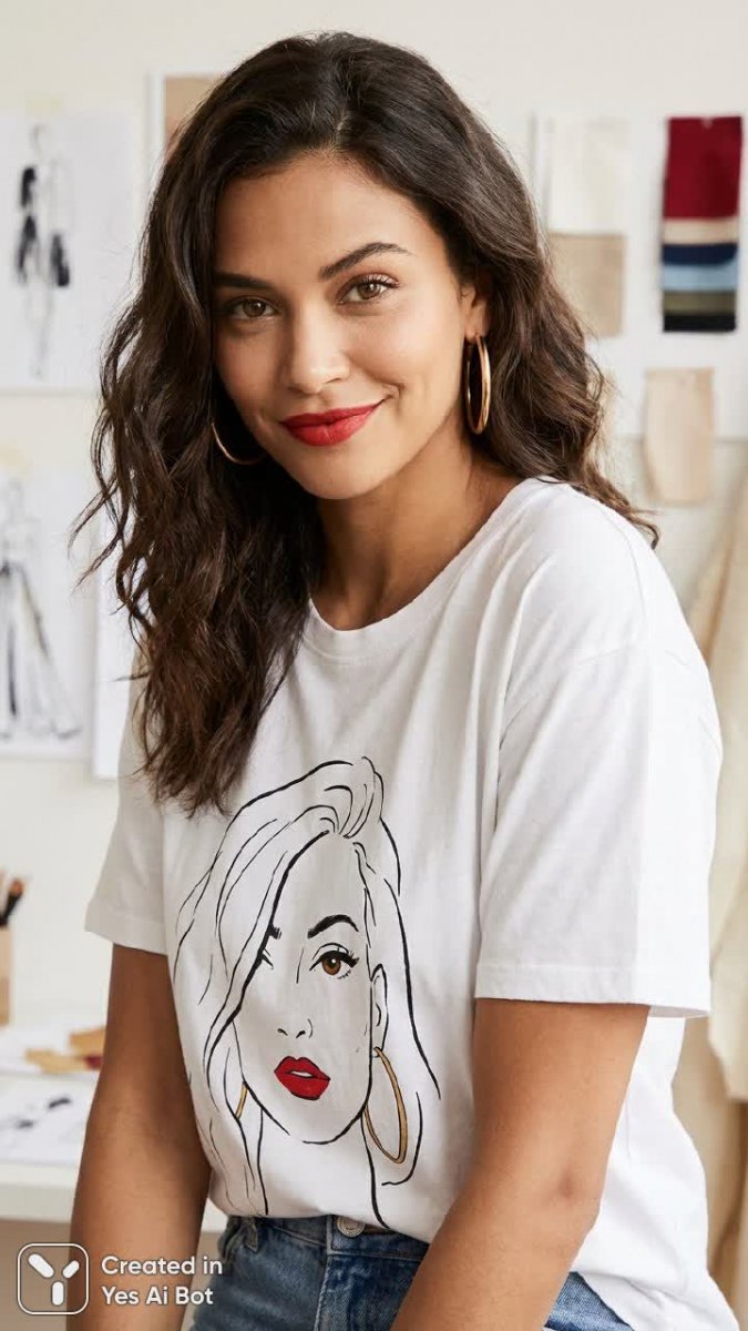 Завораживающий портрет современной женщины, сотканный из моды и искусства. Взгляд карих глаз притягивает внимание, а дерзкий макияж с акцентом на ярко-красные губы подчеркивает уверенность в себе. Простая белая футболка становится холстом для графичного изображения женского лица, выполненного смелыми черными линиями. Этот образ – воплощение непринужденной элегантности и игривого настроения. Стильные обручевые серьги добавляют изюминку в повседневный наряд, демонстрируя безупречный вкус. Здесь переплетаются элементы уличной моды и авангардного искусства, создавая визуально насыщенную композицию. Это не просто фотография модели – это художественное высказывание о красоте, силе и индивидуальности современной женщины. Каждая деталь, от тщательно подобранного гардероба до выразительного макияжа, работает на создание запоминающегося образа, который вдохновляет и привлекает внимание. Ощущение легкости и свободы сочетается с дерзкой уверенностью в себе, делая этот портрет по-настоящему особенным и ярким. Это история о самовыражении через моду и искусство, о смелости быть собой и находить красоту в простых вещах