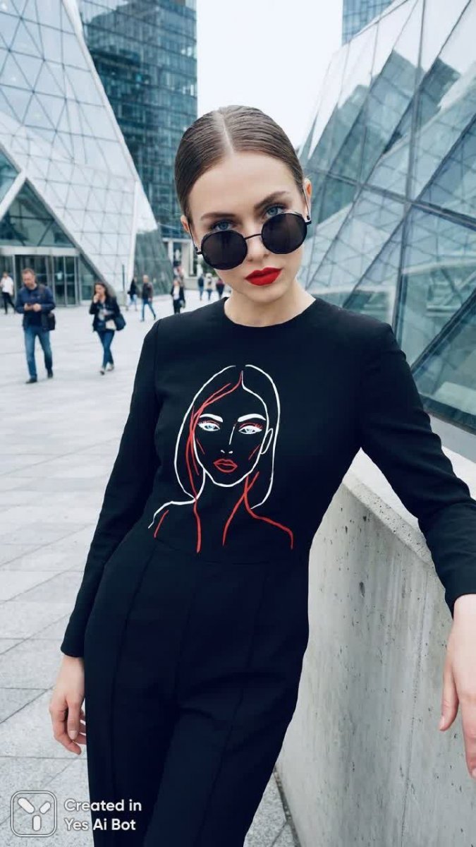 Изысканная красота в современном городе – это воплощение элегантности и смелости. Перед нами стильная модель с глубокими голубыми глазами, облаченная в эффектный черный комбинезон, украшенный ярким изображением женского лица. Акцент на чувственных красных губах притягивает взгляд, а крупные круглые солнцезащитные очки добавляют образу загадочности и шика. Минималистичная эстетика подчеркивает уверенность и независимость, а грациозная поза говорит о внутренней гармонии и безупречном вкусе. Этот образ – настоящий манифест современной моды, где классические формы сочетаются с оригинальными деталями, создавая неповторимый стиль. Городской пейзаж служит идеальным фоном для этой яркой и запоминающейся фотографии, демонстрируя динамичность и красоту жизни в большом городе. Каждая деталь продумана до мелочей: от выбора одежды до макияжа и позы модели – все работает на создание единого гармоничного образа, который вдохновляет и восхищает своей простотой и изысканностью. Это история о сильной и уверенной женщине, которая знает себе цену и не боится быть собой, выражая свою индивидуальность через моду и стиль