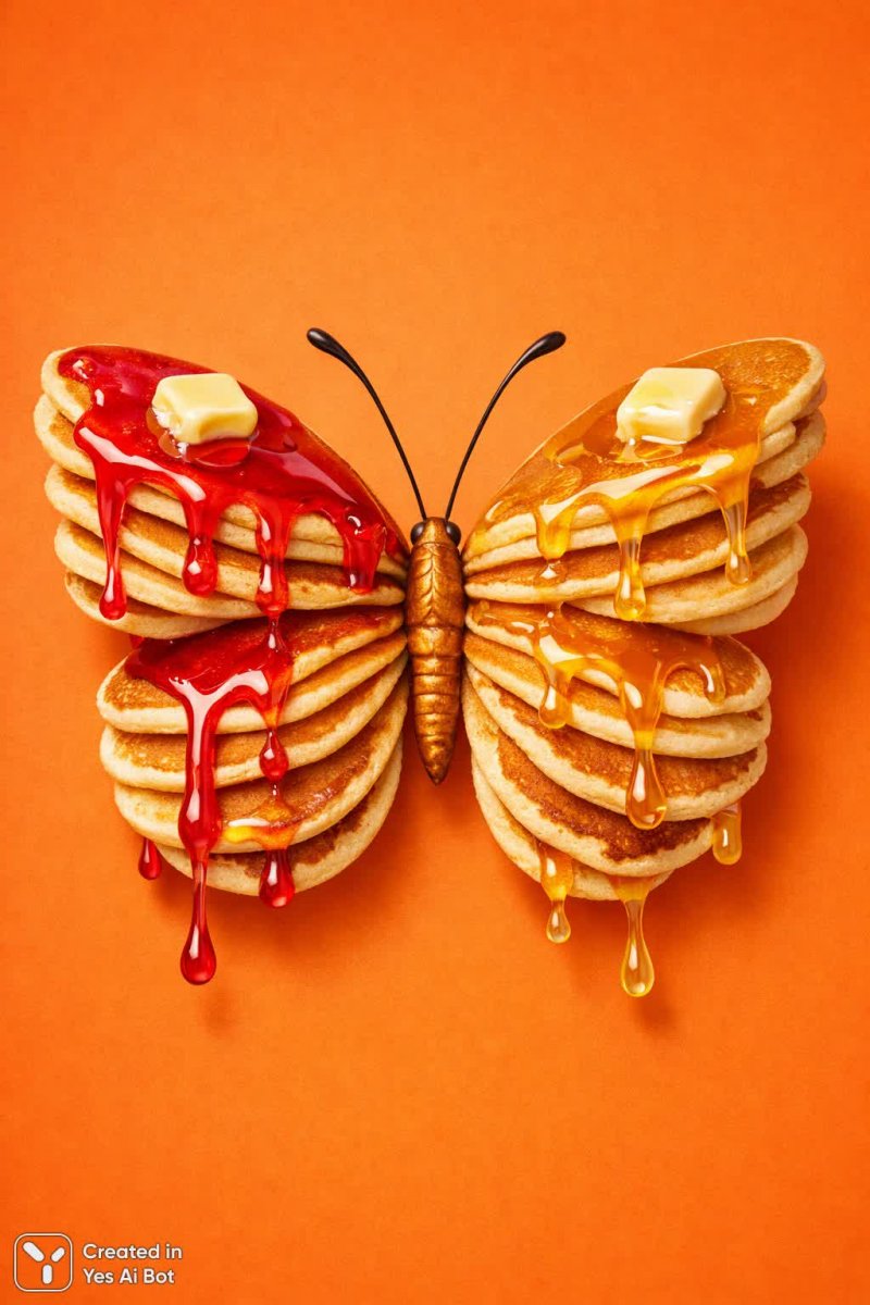 3. a colorful butterfly with wings made of layered pancakes, bright syrup dripping, against a lively orange background, playful and surreal, crisp focus, minimalist design, high detail.