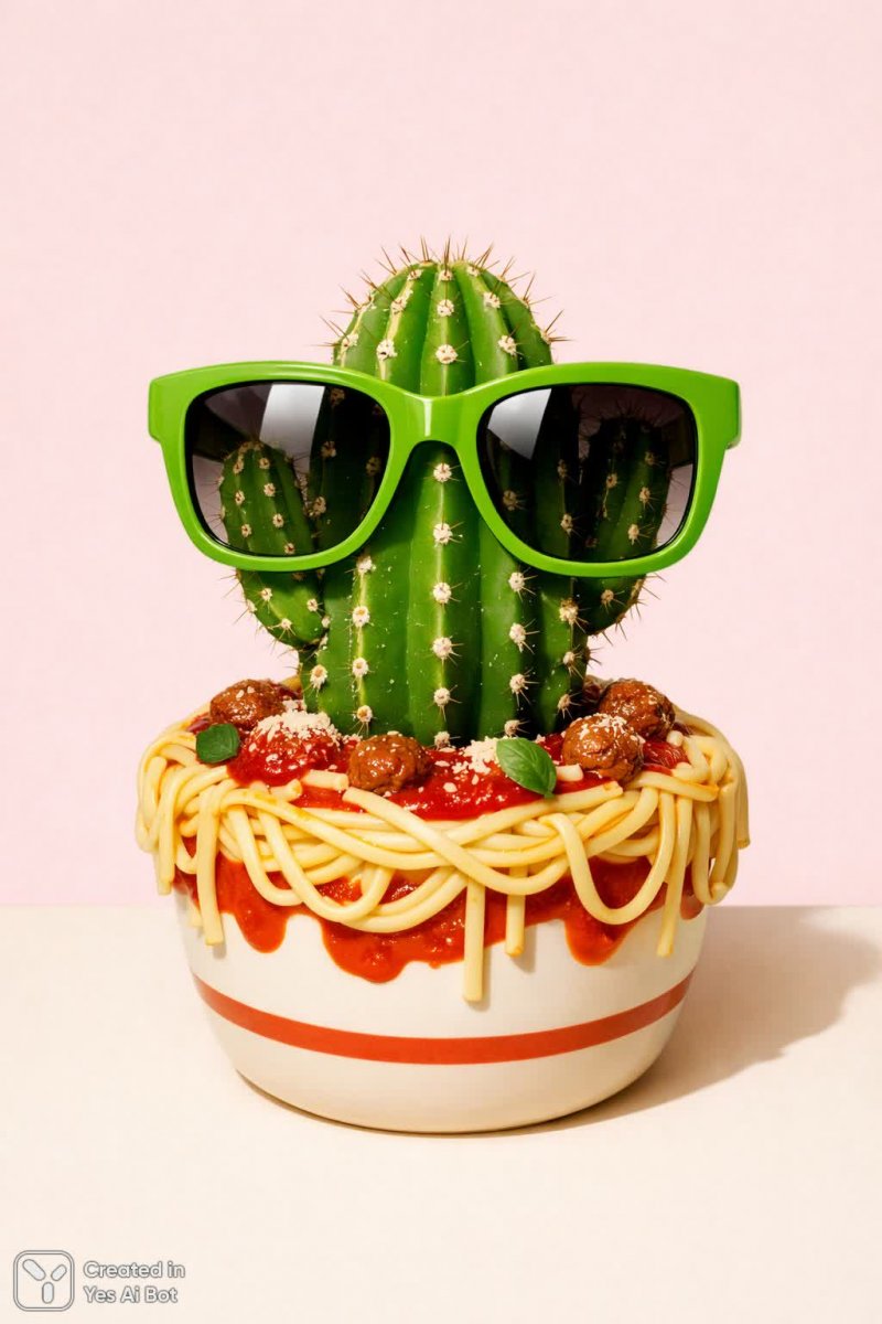 Забавный кактус изумрудно-зелёного цвета в огромных солнцезащитных очках восседает в керамическом горшке, украшенном аппетитной спагетти. Мягкий пастельный фон создаёт лёгкую и воздушную атмосферу, а игривый и причудливый стиль наполняет композицию позитивом и беззаботностью. Изображение выполнено с потрясающей чёткостью, акцентируя внимание на деталях, что позволяет оценить мастерство креативного фуд-арта. Этот необычный объект – яркий пример сочетания природы и кулинарного искусства, где кактус становится главным героем забавной сценки. Невероятная композиция демонстрирует умение художника создавать красоту из простых вещей, превращая обыденные предметы в произведения искусства. Яркие цвета и лёгкая текстура создают ощущение тепла и уюта, вызывая улыбку и желание прикоснуться к этому необычному шедевру. Это не просто фотография, а настоящая история, рассказанная через призму креативного видения художника. Кажется, что кактус готов отправиться в весёлое путешествие, полное приключений и ярких впечатлений
