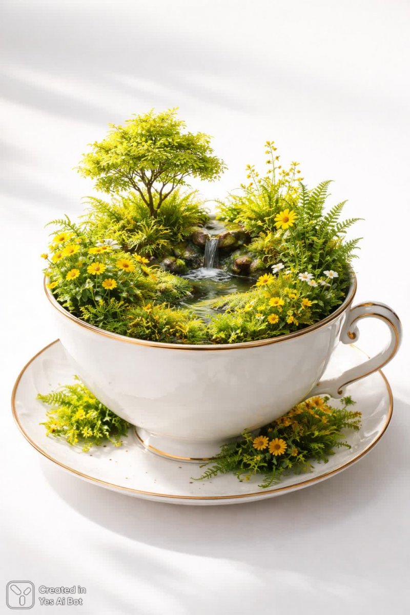 Миниатюрный сад в чашке: сюрреалистическая картина покоя - Пример генерации нейросети Sora Ai Images