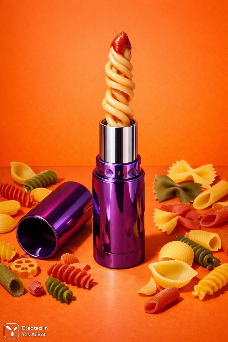 3. a glossy purple lipstick tube with a twisted piece of spaghetti as the applicator, surrounded by colorful uncooked pasta, vivid orange backdrop, surreal composition, high definition, soft shadows, contemporary pop art style.