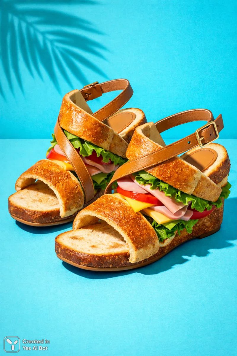 3. an artistic portrayal of a sandwich with bread slices morphing into fashionable sandals, set against a vivid turquoise backdrop, high detail, playful surrealism, crisp shadows, bright lighting.